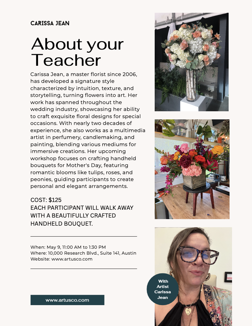 Join Carissa Jean for a special Mother’s Day floral workshop on May 9th from 11:00 AM to 1:30 PM. This hands-on class is designed to guide you through the art of creating a stunning handheld bouquet, thoughtfully crafted with mothers in mind.